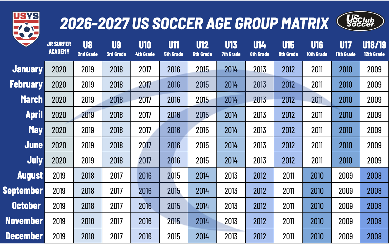 United States Soccer governing bodies have mandated that clubs return to grade-based organization of teams for the 2026-2027 season. (USYS, US Club and USSSA). Organizations will be using an August 1 to July 31 age group, for the 2026-27 season. This is a change from the previous January 1 to December 31 cut-off.